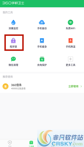 设置方法非常简单,打开360手机卫士后在主界面中点击下方“工具箱”,随后点击上方“程序锁”进入应用加密设置。初次使用该功能需要设置密码,密码分为手势图以及文字密码,设置后可以看到很多程序开关为灰色开锁状态,将需要的程序开关点击为为绿色上锁状态就成功给程序上锁了。